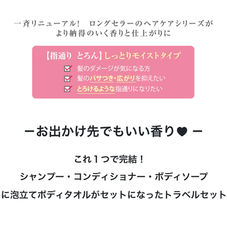 【シャンプー】 水、オレフィン(C14-16)スルホン酸Na、コカミドメチルMEA、コカミドプロピルベタイン、ココイルメチルタウリンNa、ラウロイルメチルアラニンNa、セリン、グリシン、グルタミン酸、アラニン、リシン、アルギニン、トレオニン、プロリン、セラミドEOP、セラミドNP、セラミドAP、ジラウロイルグルタミン酸リシンNa、加水分解ダイズタンパク、センチフォリアバラ花エキス、ローズ水、カニナバラ果実エキス、チャ葉エキス、モモ種子エキス、モモ葉エキス、ゼイン、加水分解エンドウタンパク、PPG-3カプリリルエーテル、ポリクオタニウム-10、ベタイン、PCA-Na、DPG、エタノール、ソルビトール、フィトスフィンゴシン、コレステロール、ラウロイルラクチレートNa、カルボマー、キサンタンガム、エチルヘキシルグリセリン、BG、PEGー40水添ヒマシ油、クエン酸、塩化Na、ゼラチン、タンニン酸、ヘキサメタリン酸Na、フェノキシエタノール、メチルパラベン、プロピルパラベン、香料 【コンディショナー】 水、セタノール、ベヘントリモニウムクロリド、オレイルアルコール、ステアリン酸グリセリル、セリン、グリシン、グルタミン酸、アラニン、リシン、アルギニン、トレオニン、プロリン、セラミドEOP、セラミドNP、セラミドAP、ジラウロイルグルタミン酸リシンNa、加水分解ダイズタンパク、センチフォリアバラ花エキス、ローズ水、カニナバラ果実エキス、チャ葉エキス、モモ種子エキス、モモ葉エキス、ゼイン、加水分解エンドウタンパク、ポリクオタニウム-64、PPG-3カプリリルエーテル、ベタイン、PCA-Na、DPG、ソルビトール、ヒドロキシエチルセルロース、フィトスフィンゴシン、コレステロール、ラウロイルラクチレートNa、カルボマー、キサンタンガム、ジメチコン、アモジメチコン、ミネラルオイル、PEG-200水添ヒマシ油、エチルヘキシルグリセリン、クエン酸、BG、ゼラチン、タンニン酸、ヘキサメタリン酸Na、エタノール、フェノキシエタノール、メチルパラベン、プロピルパラベン、香料 【ボディソープ】 水、ミリスチン酸、ラウリン酸、コカミドメチルMEA、水酸化K、グリセリン、パルミチン酸、ラウラミドプロピルベタイン、ラウレス硫酸Na、PG、ジステアリン酸グリコ―ル、ヒアルロン酸Na、加水分解コラ―ゲン(魚)、加水分解シルク、リン酸アスコルビルMg、スクワラン、シア脂、PCA-Na、セリン、グリシン、グルタミン酸、アラニン、リシン、アルギニン、トレオニン、プロリン、ヨ―グルト液(牛乳)、ベタイン、ソルビトール、グア―ヒドロキシプロピルトリモニウムクロリド、エチドロン酸、BG、塩化Na、ゼラチン、タンニン酸、ヘキサメタリン酸Na、フェノキシエタノ―ル、メチルパラベン、プロピルパラベン、香料 ボディタオル: 80×14cm ポリエステル75% ナイロン25%